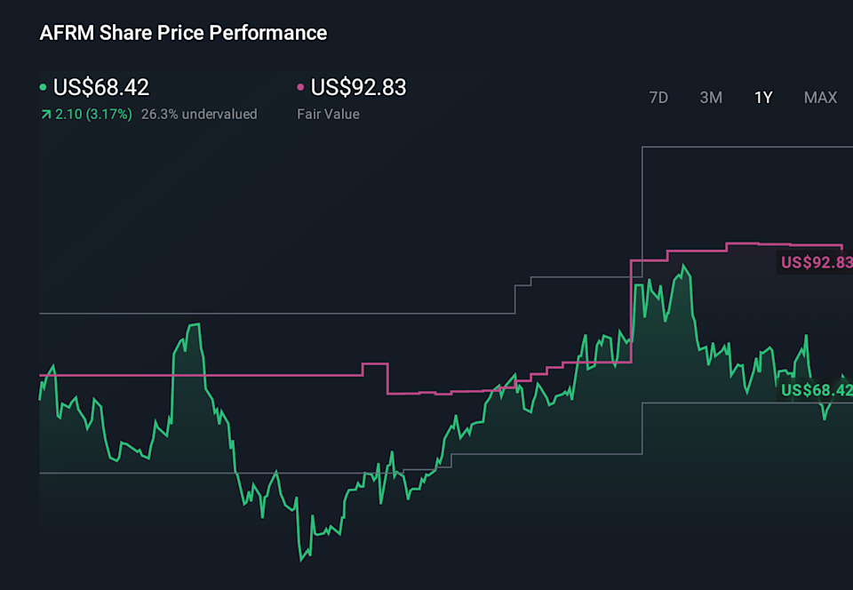 For Affirm to make sense in your portfolio, you have to believe its “buy now, pay later” rails can extend well beyond online checkout into everyday spending, small-business invoicing and bank debit programs. The latest quarter’s earnings beat and raised outlook support that thesis in the near term, but the market’s 5% weekly pullback suggests investors are still wrestling with questions around credit performance and how much growth is already reflected in a rich earnings multiple. The new partnerships with QuickBooks, Expedia, Wayfair, Fiserv and Bolt strengthen near-term catalysts by broadening Affirm’s reach across travel, ecommerce, SMBs and traditional banking, potentially deepening transaction volume and merchant stickiness. At the same time, those wins do not remove the key risks around valuation, funding costs and any future uptick in credit losses.