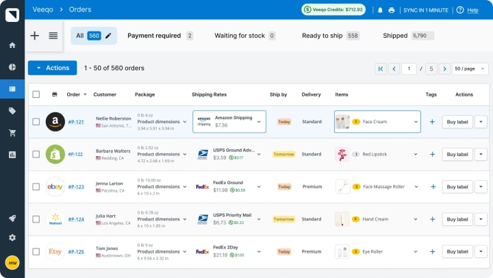 You connect your sales channels once, and Veeqo centralizes all your orders. It supports Amazon, eBay, Shopify, Etsy, WooCommerce and many other marketplaces and shopping carts. From there, you can buy and print shipping labels in bulk, track orders, automate repetitive steps and keep inventory accurate across every channel.