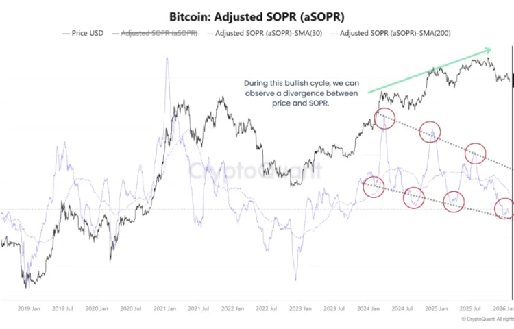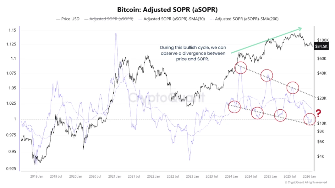 The Adjusted Spent Output Profit Ratio (aSOPR) is an on-chain metric used to measure whether Bitcoin investors are, on average, selling their coins at a profit or at a loss, while filtering out noise from short-term, low-value movements. In usual market trends, each new price peak is accompanied by higher conviction as investors are willing to hold longer, take profits later, and tolerate larger drawdowns because they expect even higher prices.