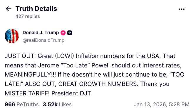 After CPI, Trump reiterated his request for lower rates — something that would notionally have a positive impact on liquidity flowing into risk assets and crypto.