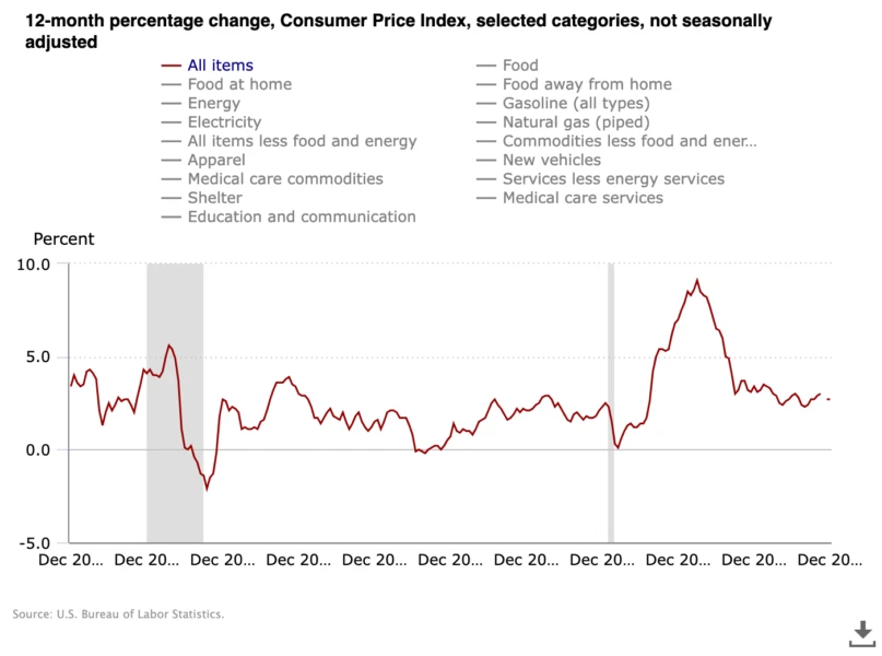 “The all items index rose 2.7 percent for the 12 months ending December, the same increase as over the 12 months ending November,” it wrote in an official statement.