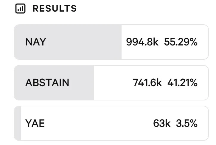 On Friday, the snapshot poll closed with 55.29% voting “NAY” and 41.21% abstaining. Only 3.5% of voters supported the proposal.