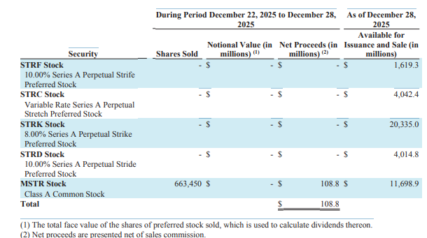 During the same period, Strategy sold roughly 663,450 shares of MSTR stock, generating net proceeds equal to the amount deployed into bitcoin. The company did not issue any preferred shares during the week.