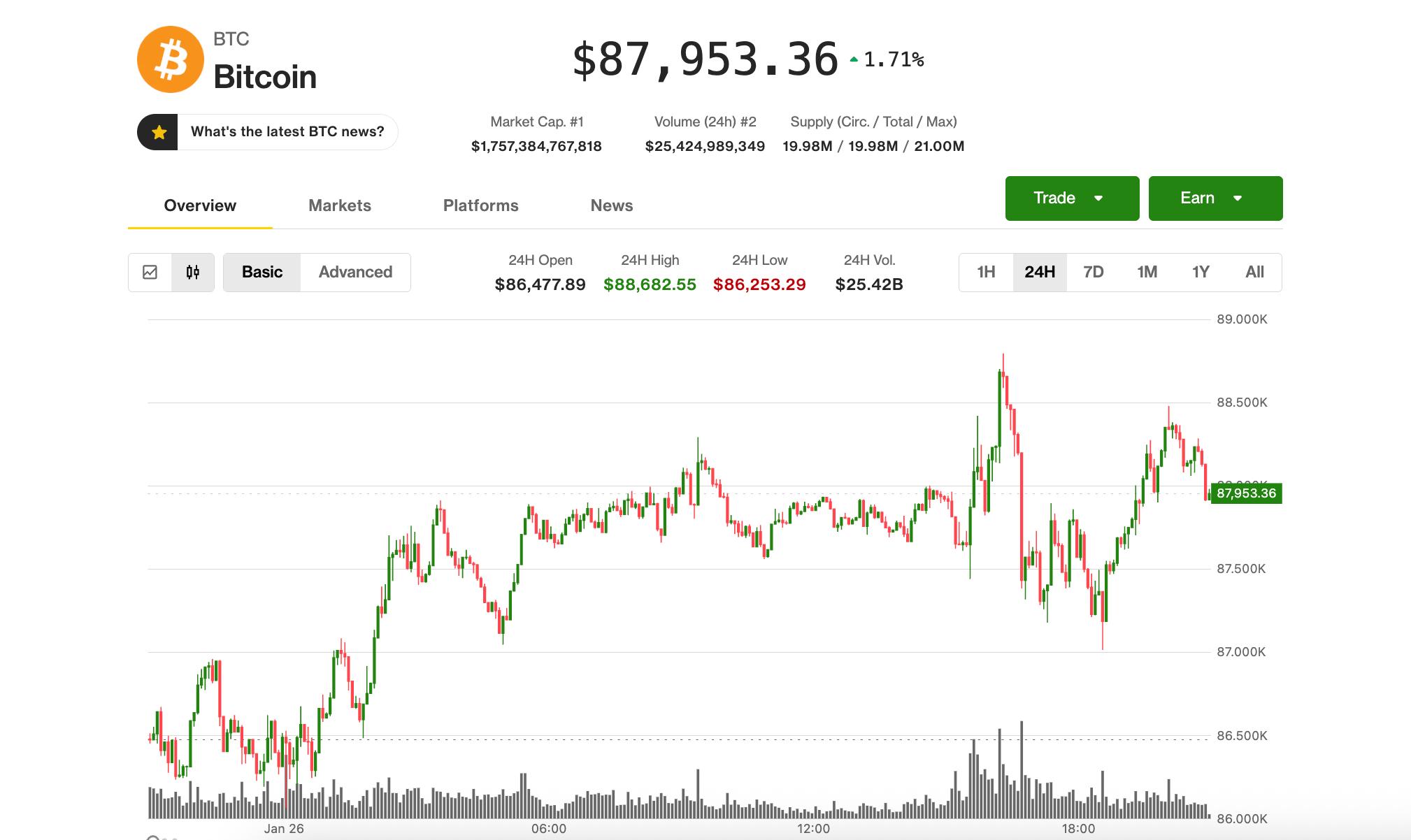 Bitcoin remained stuck in limbo at around $88,000 on Monday as gold and silver extended their blistering rallies before paring gains.
