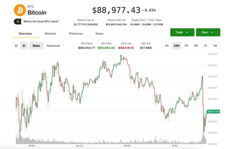 The crypto market traded in a tight range on Friday with bitcoin changing hands at $88,950 and ether losing around 1% since midnight UTC to $2,920.