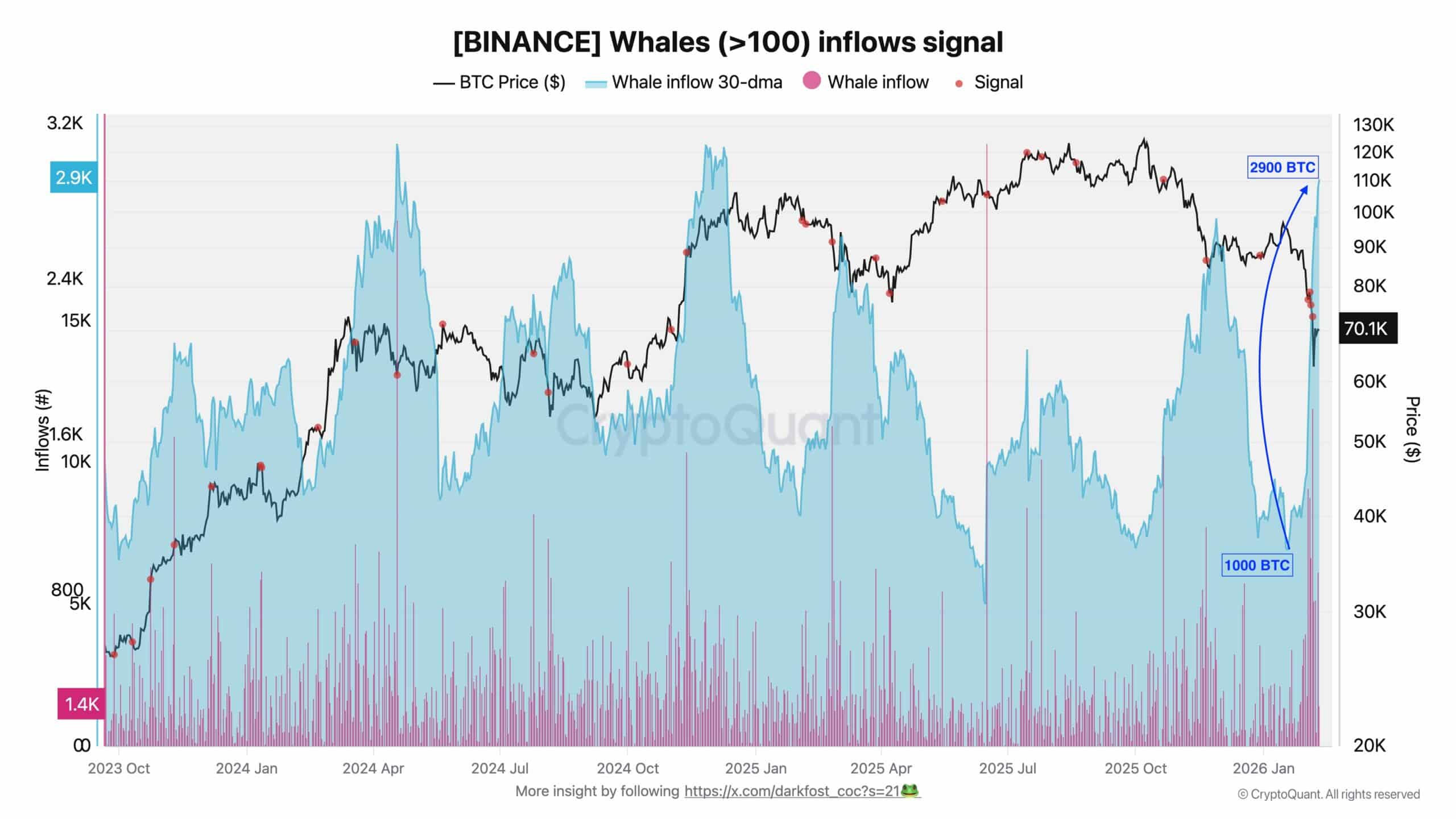 Data tracking Binance inflows from large holders (100+ BTC) highlighted a rise in coins moving to exchanges as Bitcoin fell from $95k to near $60k.