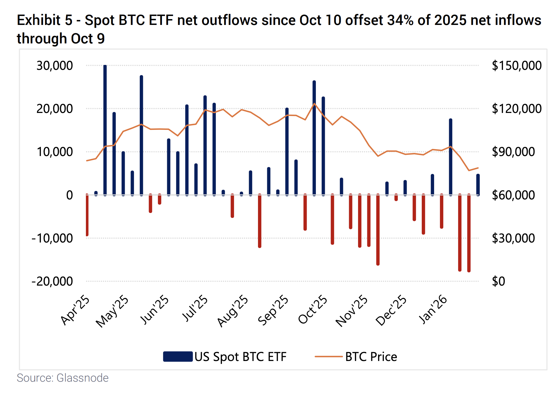 In addition, retail investors who had bought into Bitcoin via exchange-traded funds (ETFs) offered by traditional finance platforms are also selling. “Spot BTC ETF net outflows during the weeks of Jan. 19 and Jan. 26 marked the second and third largest since inception and were followed by large net outflows on Feb. 4,” he said: