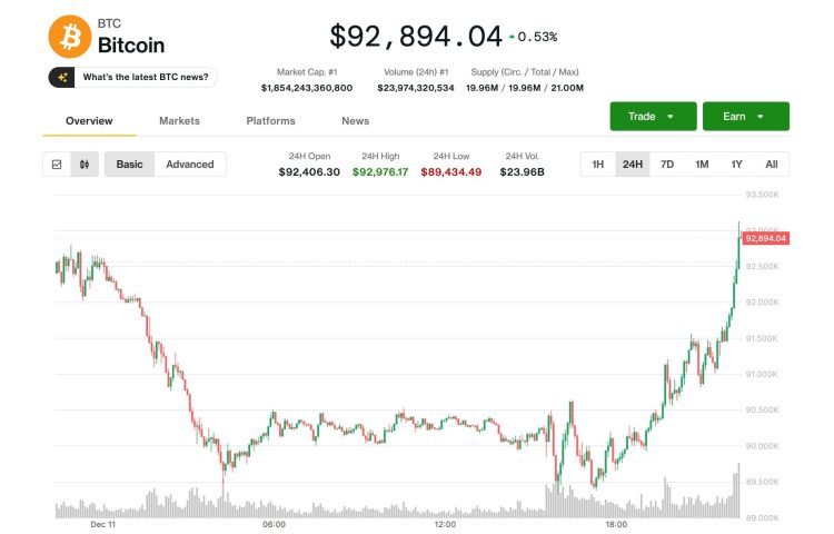 Bitcoin is up 2.4% over 24 hours and is currently trading at $92,250, according to CoinGecko data.