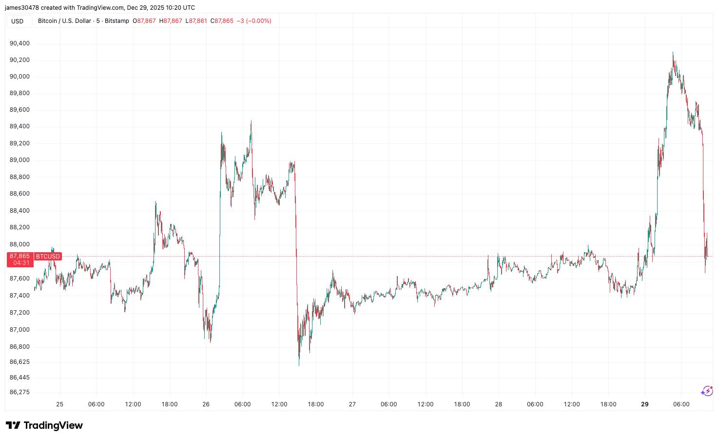 The leading cryptocurrency by market value dropped below $88,000, having peeped above $90,000, CoinDesk data show. Major altcoins including , ether , solana and also retraced their adances. The CoinDesk 20 Index (CD20) pulled back to 2,726, roughly where it was in early Asia before it popped to 2,789.