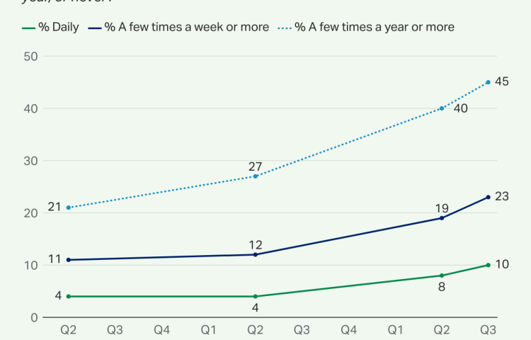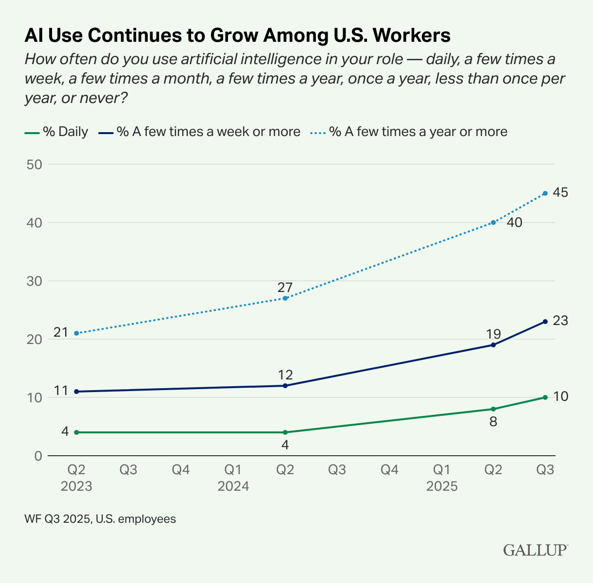 According to a new Gallup report, the share of U.S. employees who use AI at work at least a few times a year rose from 40% to 45% between the second and third quarters of 2025. Frequent use (a few times a week or more) climbed from 19% to 23%, while daily use inched up from 8% to 10% over the same period. The findings come from a nationally representative survey of 23,068 U.S. adults employed full- or part-time.