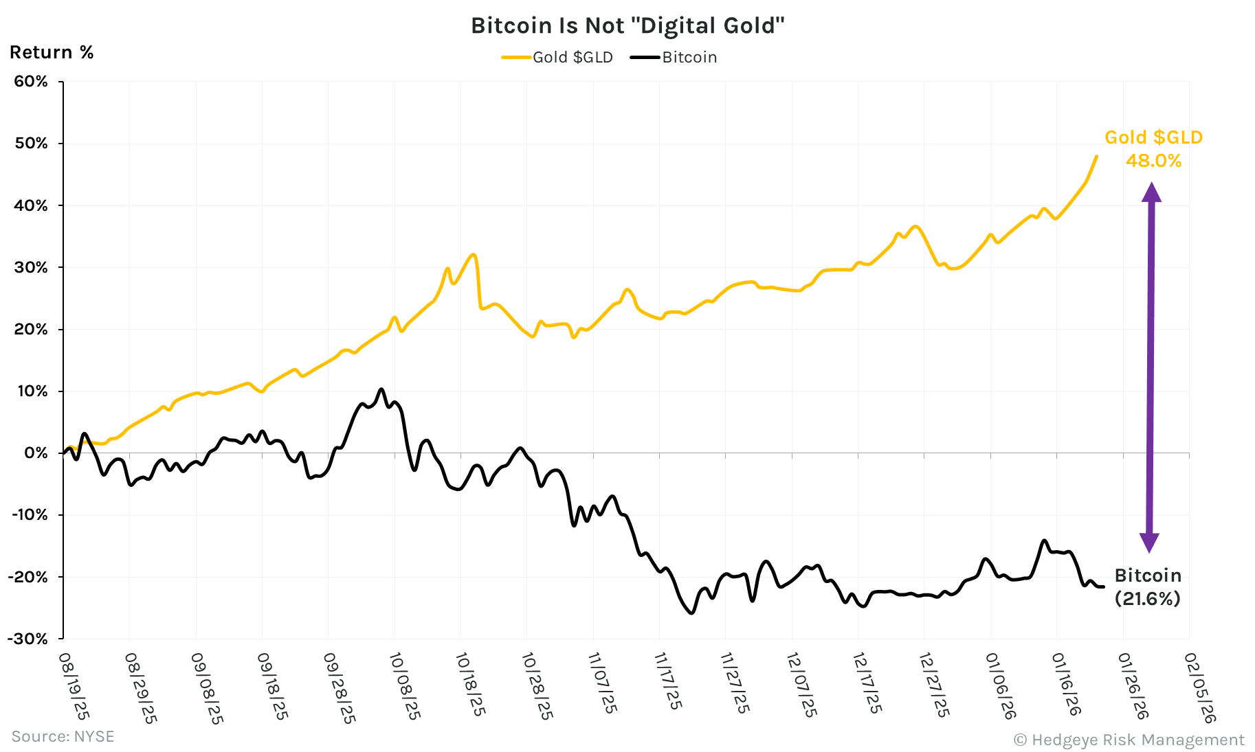 Bitcoin CHART OF THE DAY: Bitcoin Is Not “Digital Gold” This post was originally published on this site. By HedgeyeJanuary 23, 2026January 24, 2026No comment