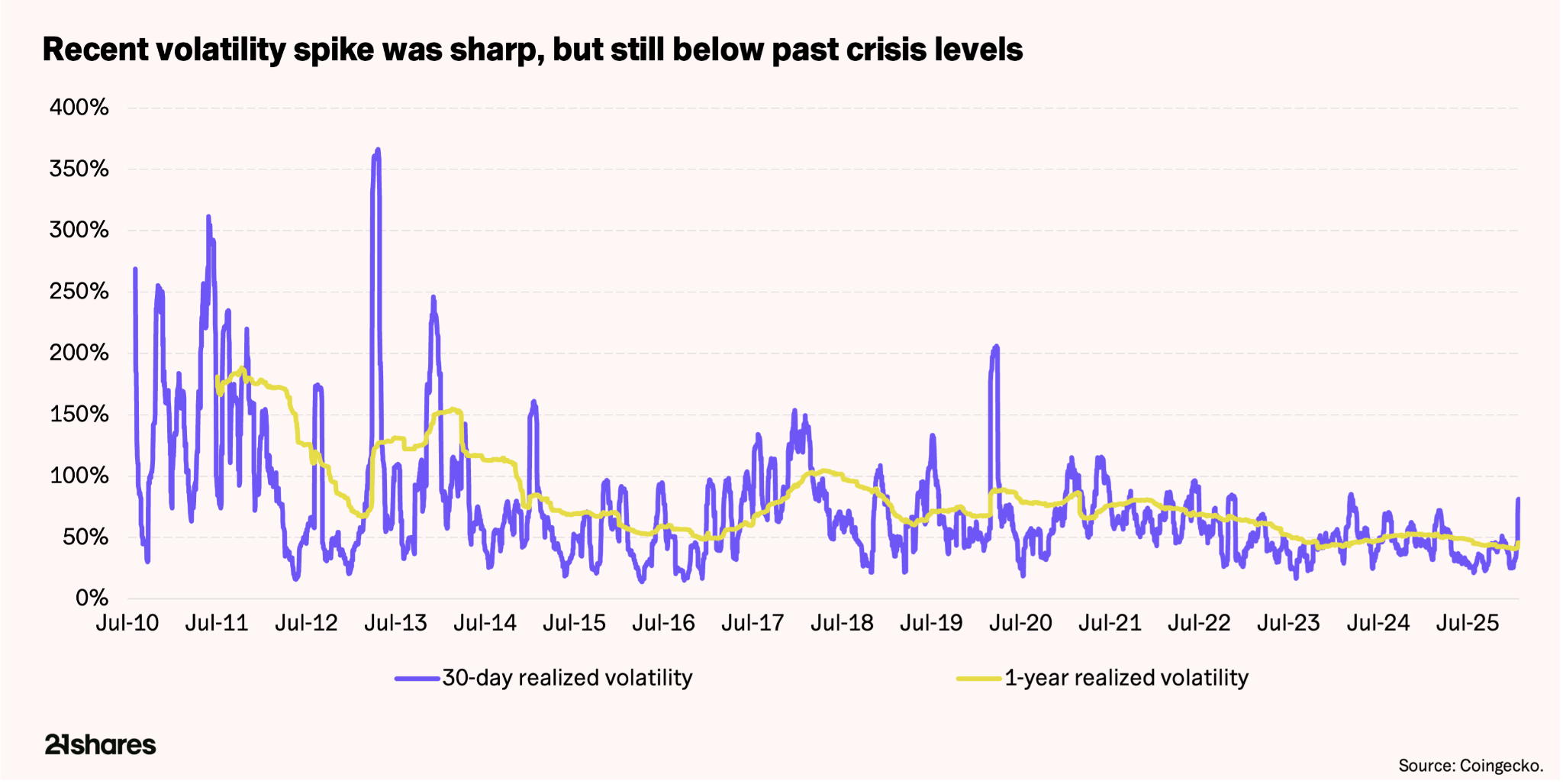The recent sell-off was rough, but it occurred in a structurally different environment than prior cycles. Bitcoin’s realized volatility tells the story: During peak stress, seven-day realized volatility reached ~156%. To put this figure in perspective, Bitcoin’s realized volatility peaked near ~385% in the beginning of the COVID pandemic in March 2020.