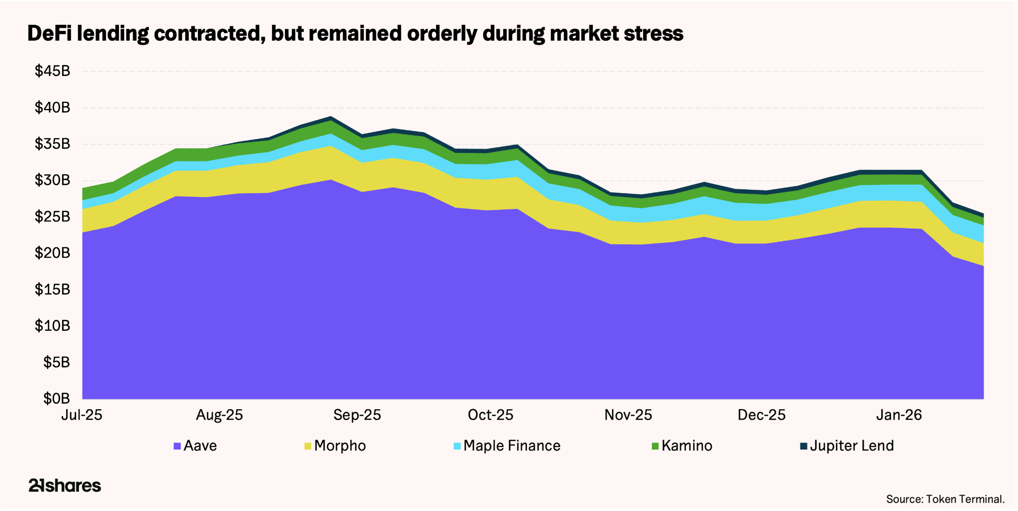 In DeFi lending, outstanding loans declined ~16% (from ~$37 billion to ~$31 billion). Importantly, the pullback was not uniform. The contraction was concentrated in higher-risk venues, while more established platforms demonstrated relative resilience: