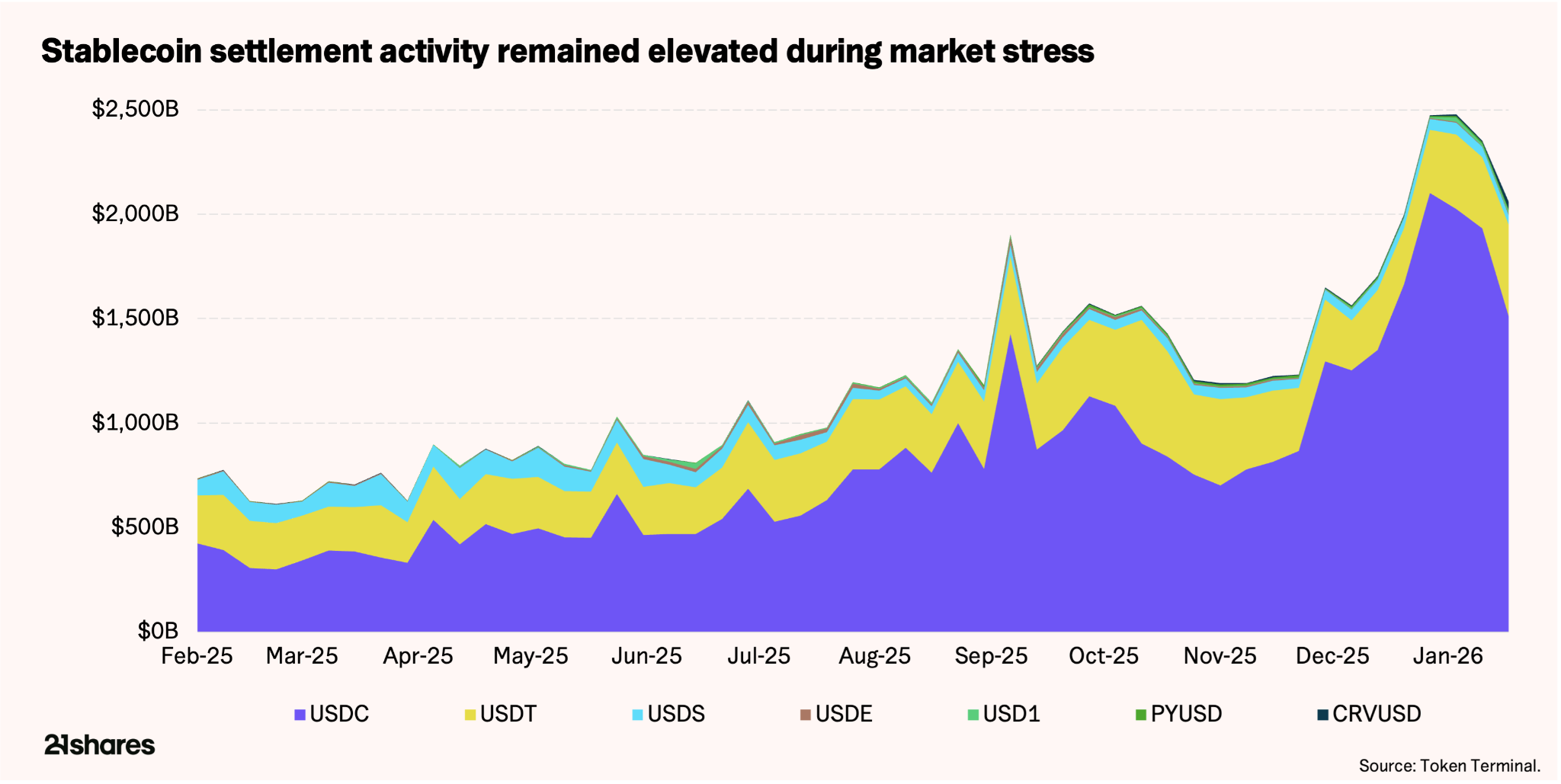 Operationally, stablecoins continued to function as intended. Peg stability was maintained throughout the volatility, and USDT processed over ~$1.9 trillion5 in transfer volume over the past 30 days, including during peak stress.