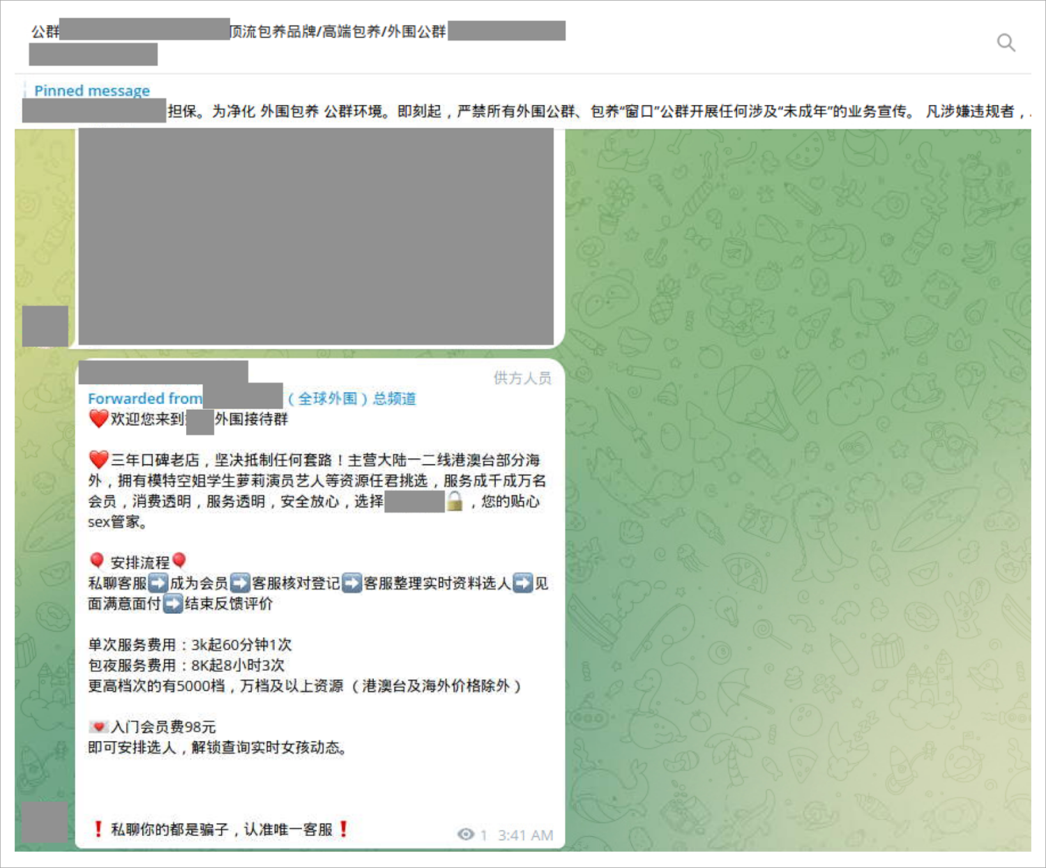 - “International escort” services: Telegram-based services that are suspected to traffic in people
