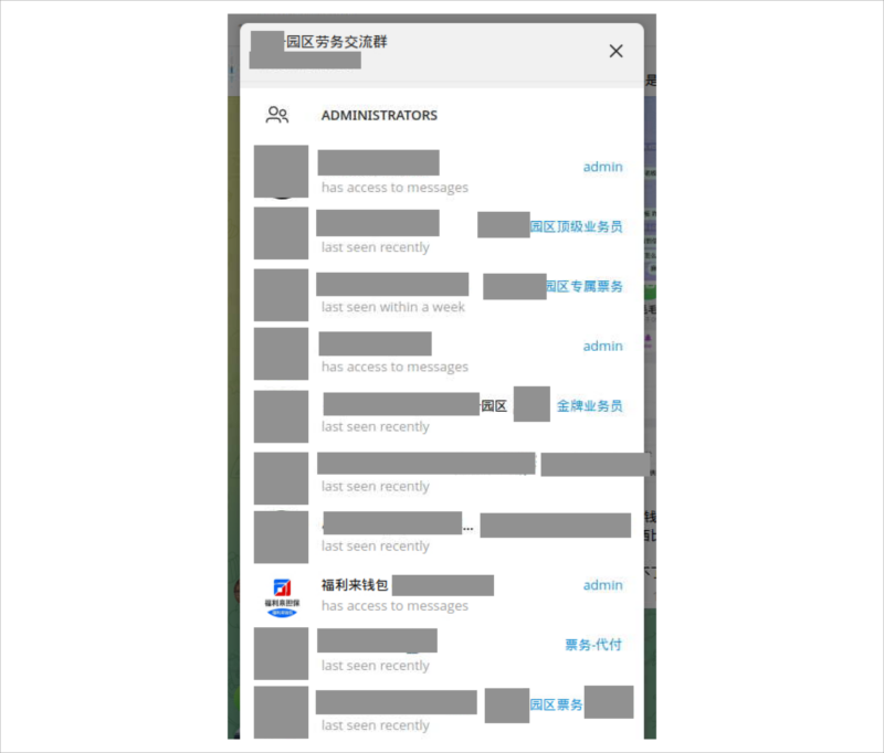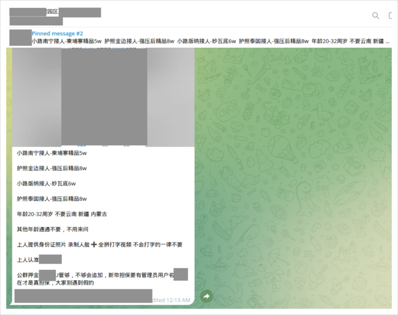 The involvement of established criminal organizations became evident through our analysis of trafficking-related channels. For example, we identified an administrator account linked to the “Fully Light Group,” a Kokang-based organization previously flagged by the United Nations Office on Drugs and Crime (UNODC) for illegal gambling and money laundering. Their presence in channels facilitating transactions between scam compounds and “labor placement” agents suggests how established criminal networks provide critical financial infrastructure for trafficking operations.