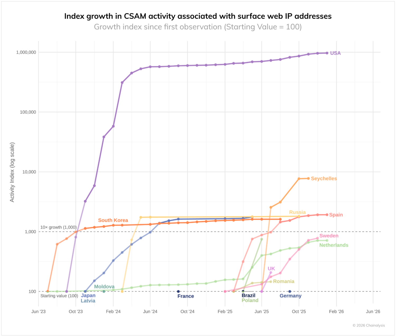 Chris Hughes, Internet Watch Foundation Hotline Director, told us, “In 2025, the Internet Watch Foundation identified 312,030 reports containing child sexual abuse images and videos. This is more than ever before, with an increase of 7% from the previous year. Early analysis of IWF data indicates that most clearweb sites offering virtual currency as a payment for child sexual abuse are hosted in the US, while darkweb sites were the second highest. Any payment information that we identify on commercial websites is captured and shared with global law enforcement and organisations like Chainalysis to disrupt further distribution of criminal imagery and to help in the investigation of those who create, share and profit from the sale of child sexual abuse material.”