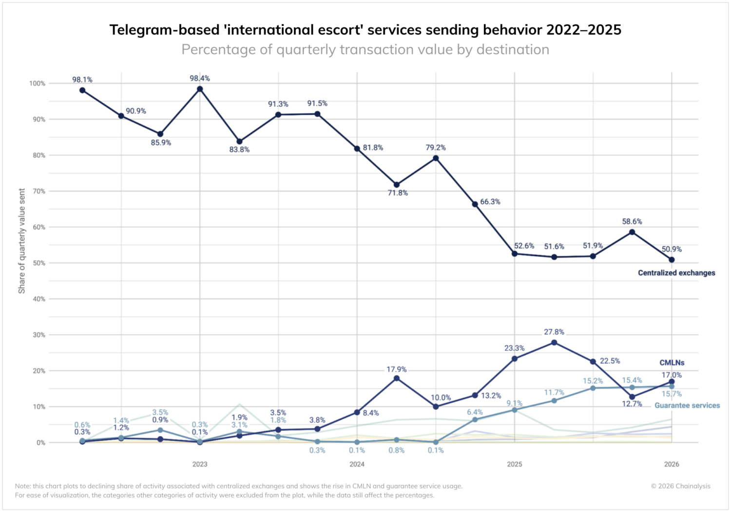 The cryptocurrency footprint of escort services reveals sophisticated integration with established financial infrastructure, particularly CMLNs and guarantee platforms. While some escort services operate legally, cryptocurrency transaction patterns help identify potential trafficking operations through their distinct financial behaviors.