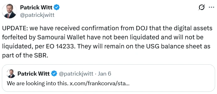 “We have received confirmation from DOJ that the digital assets forfeited by Samourai Wallet have not been liquidated and will not be liquidated,” Witt posted to X Friday, adding that the forfeited Bitcoin would remain part of the Strategic Bitcoin Reserve.