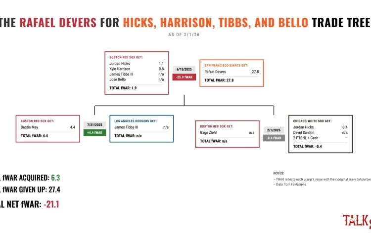 The Red Sox received four players from the Giants: reliever Jordan Hicks, bulk reliever Kyle Harrison, outfield prospect James Tibbs, and pitching prospect Jose Bello. Come February 2026, Harrison and Bello are the only remaining pieces from the trade. The team quickly parted with Tibbs at the trade deadline, sending him to the Dodgers for Dustin May. Hicks is now the Chicago White Sox’s problem.