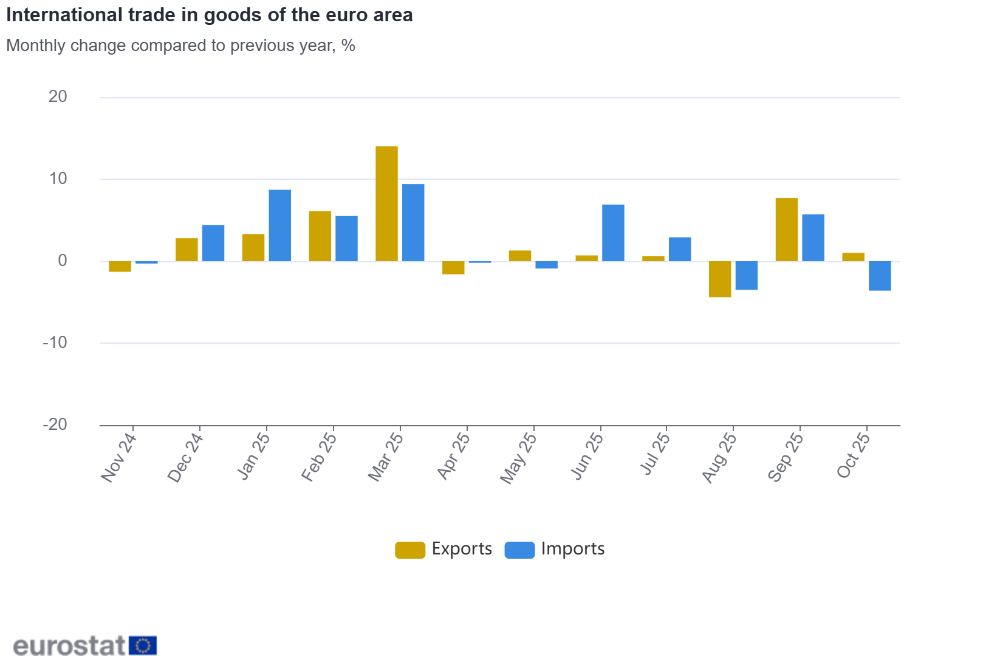 The first estimates of euro area balance showed a €18.4 bn surplus in trade in goods with the rest of the world in October 2025, compared with + €7.1 bn in October 2024.