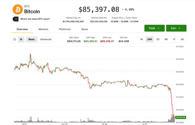 Bitcoin price news: BTC falls back to $85,200 alongside selloffs in stocks and precious metals