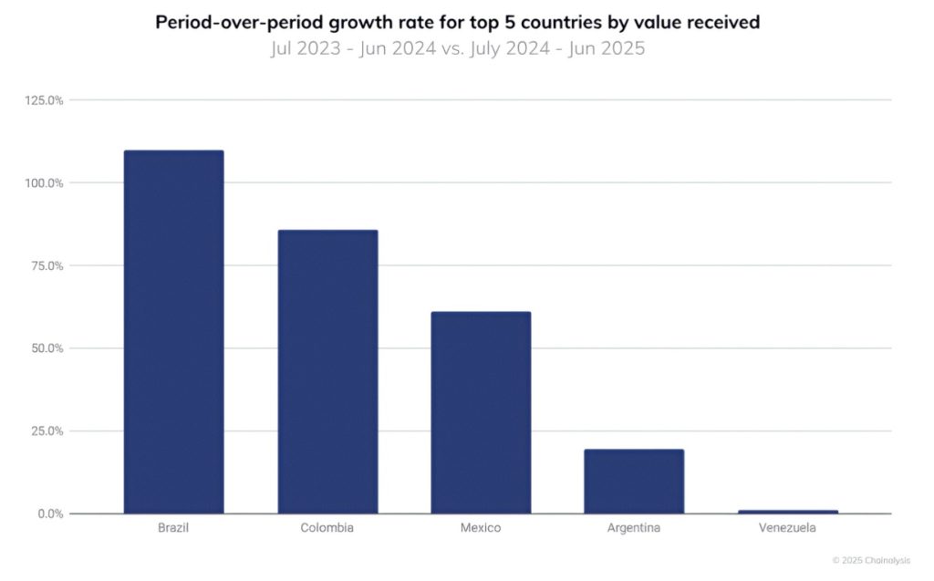 ” href=”https://www.disruptionbanking.com/Fintech Glossary/bitcoin/” data-gt-translate-attributes=”[{“attribute”:”data-cmtooltip”, “format”:”html”}]” tabindex=”0″ role=”link”>Bitcoin or dollar-pegged stablecoins to protect their earnings. Chainalysis ranked Venezuela third globally for grassroots crypto adoption in 2020, reflecting how pervasive crypto use became amid the crisis. Compared to the past adoption index for Latin America (LatAm), between July 2024 and June 2025, Venezuela raked in $44.6 billion in transaction volume, as the Chainalysis data below shows.