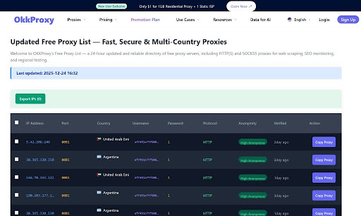 Before committing to a paid plan, I used OkkProxy’s free proxy list to prototype my setup. It provides daily updated free proxy IPs supporting HTTP, HTTPS, and SOCKS5 protocols—great for initial testing of regional access or SEO monitoring.