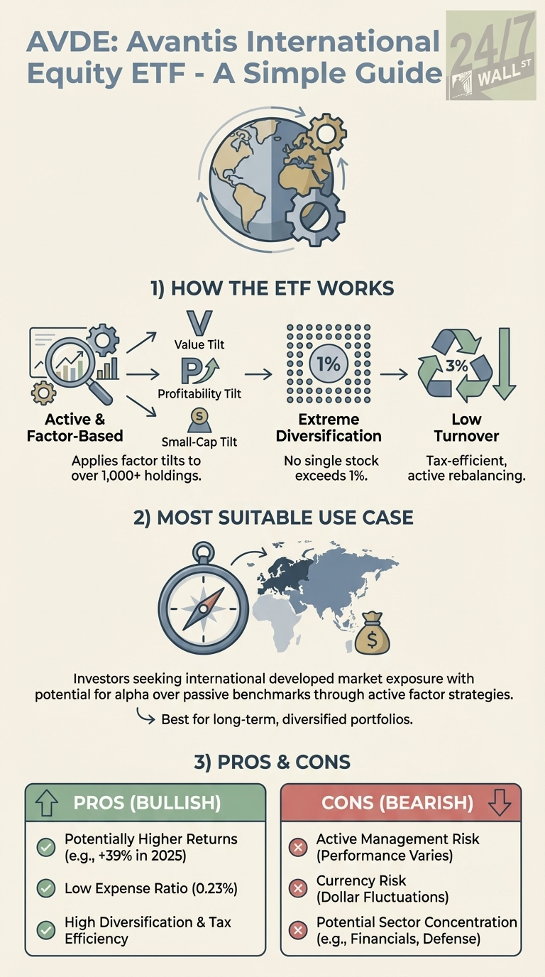 AVDE isn’t passive. It applies factor tilts toward value, profitability, and smaller companies within developed international markets. That means it naturally overweights financials and industrials while underweighting mega-cap tech. That positioning worked perfectly in 2025. The fund’s largest holding is cash at 1.19%, with no single stock exceeding 1%. This extreme diversification across more than 1,000 positions gives it exposure to trends without concentration risk.