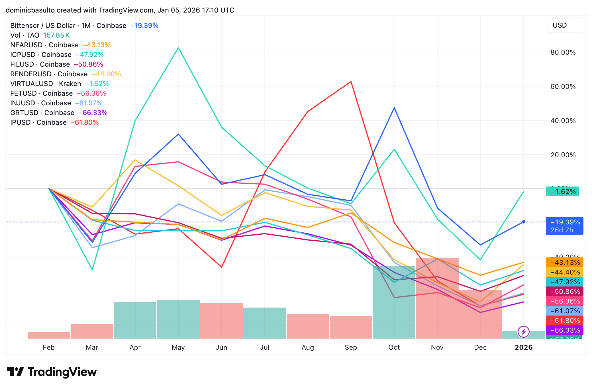 To get started, it’s helpful to chart the performance of artificial intelligence coins during the past year. Yes, the chart is ugly — but it helps to see which coins are moving in lockstep with each other, and which ones might be capable of breaking away from the pack in 2026.