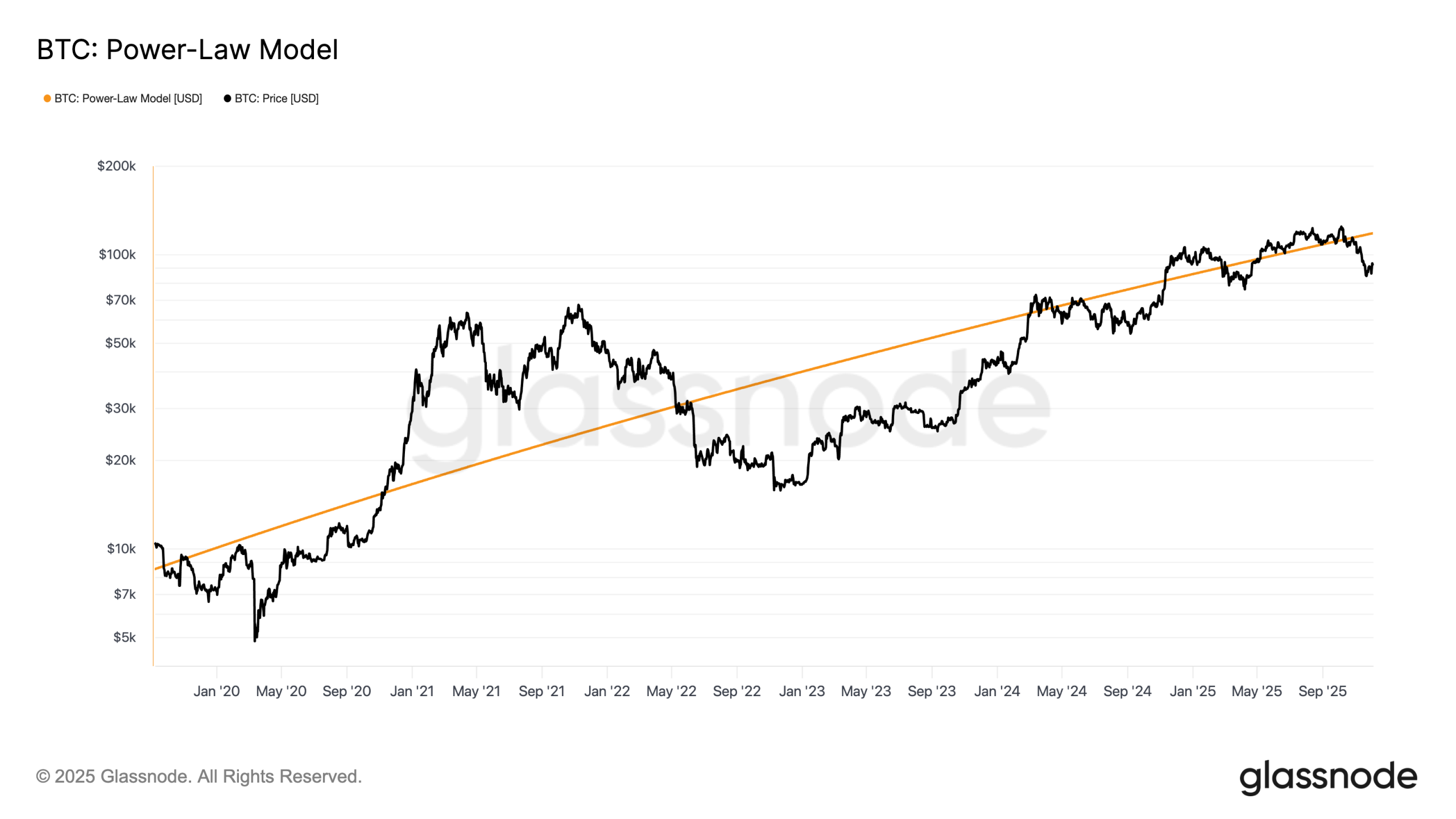Below $90,000, bitcoin currently trades at a steep discount to the model. The power law value sits near $118,000 which places the spot price roughly 32% beneath the model. This is the largest deviation since the yen carry trade unwind back in august 2024, which produced a 35% deviation from the trend line and took three months to recover.