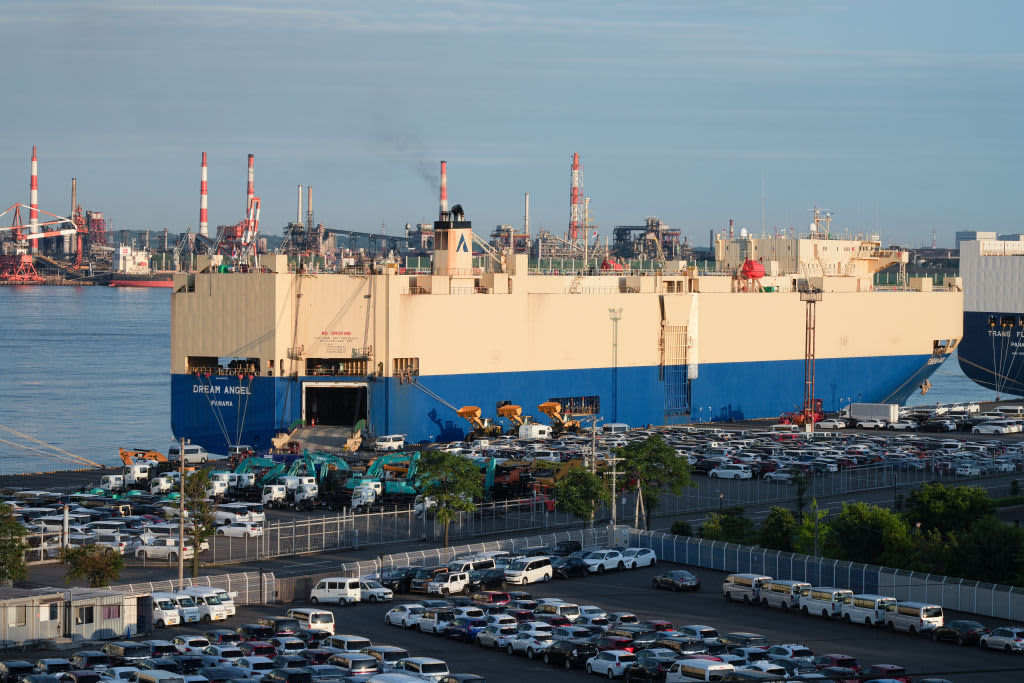 Vehicles bound for shipment parked in front of the Dream Angel vehicles carrier ship at the Nagoya Port in Nagoya, Japan, on Tuesday, June 18, 2024.