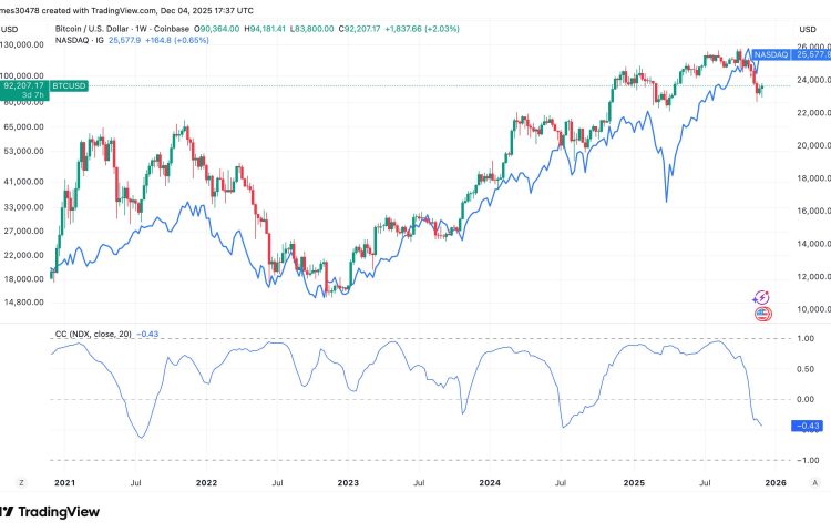 BTC’s Negative Correlation With Nasdaq Persists, and History Suggests a Bottom May Be Forming