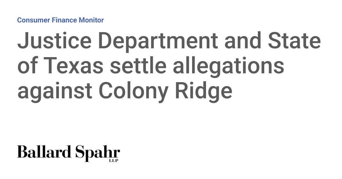 Finance Justice Department and State of Texas settle allegations against Colony Ridge This post was originally published on this site. By Richard J. Andreano, Jr., John L. Culhane, Jr.February 12, 2026February 13, 2026No comment