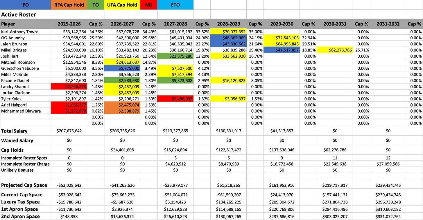 As previously stated, no singular decision is made in isolation. Every signing, trade, and draft pick carries with it a cascading impact and fits within the Front Office’s greater strategic plan. Front Offices sequence Cap Sheets and embed timelines and windows of opportunity into these plans many years in advance, paying close attention to, among other things, projected finances, Apron thresholds, potential extensions, and financial inflection points. This has been particularly true of the Knicks under Rose and, more specifically, Brock Aller.
