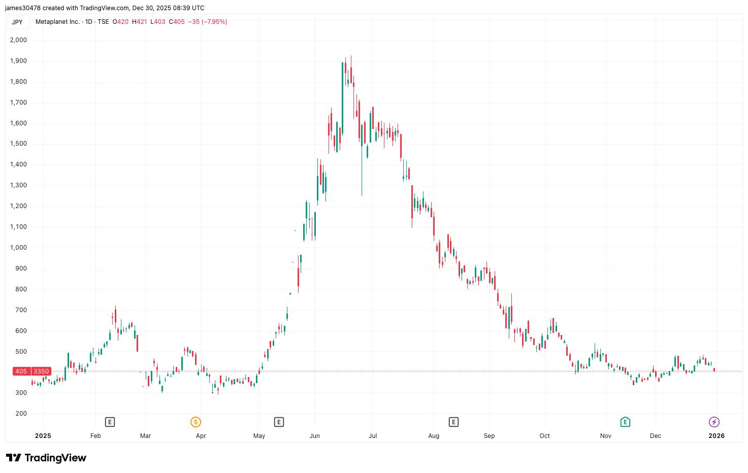 Metaplanet has now spent some $3.78 billion, at an average purchase price of $107,607, according to the company’s dashboard. The company’s shares rose 8% this year, to close at 405 yen ($2.60). Still, they’re down 80% from the all-time high they touched in June.