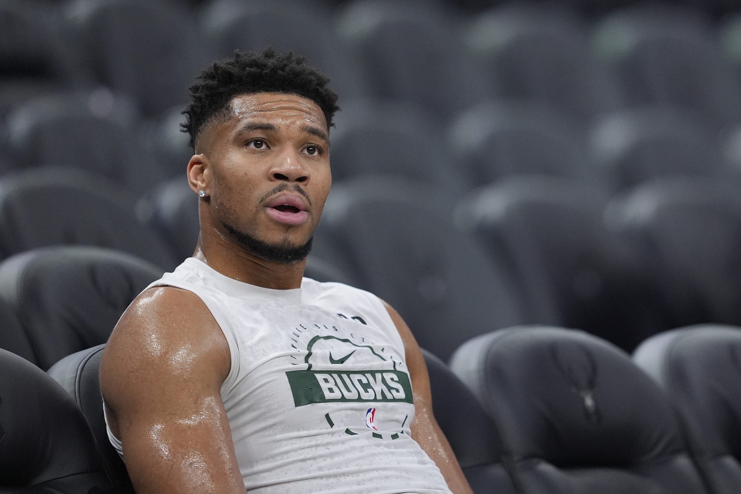 MILWAUKEE, WISCONSIN – FEBRUARY 03: Giannis Antetokounmpo #34 of the Milwaukee Bucks sits by the court before a game against the Chicago Bulls at Fiserv Forum on February 03, 2026 in Milwaukee, Wisconsin. NOTE TO USER: User expressly acknowledges and agrees that, by downloading and or using this photograph, User is consenting to the terms and conditions of the Getty Images License Agreement. (Photo by Patrick McDermott/Getty Images)Getty Images