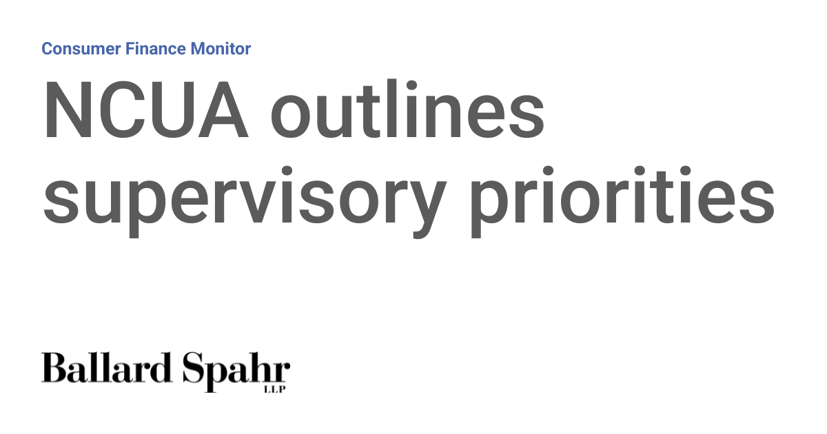Finance NCUA outlines supervisory priorities This post was originally published on this site. By John L. Culhane, Jr., Richard J. Andreano, Jr., Joseph J. SchusterJanuary 20, 2026January 20, 2026No comment