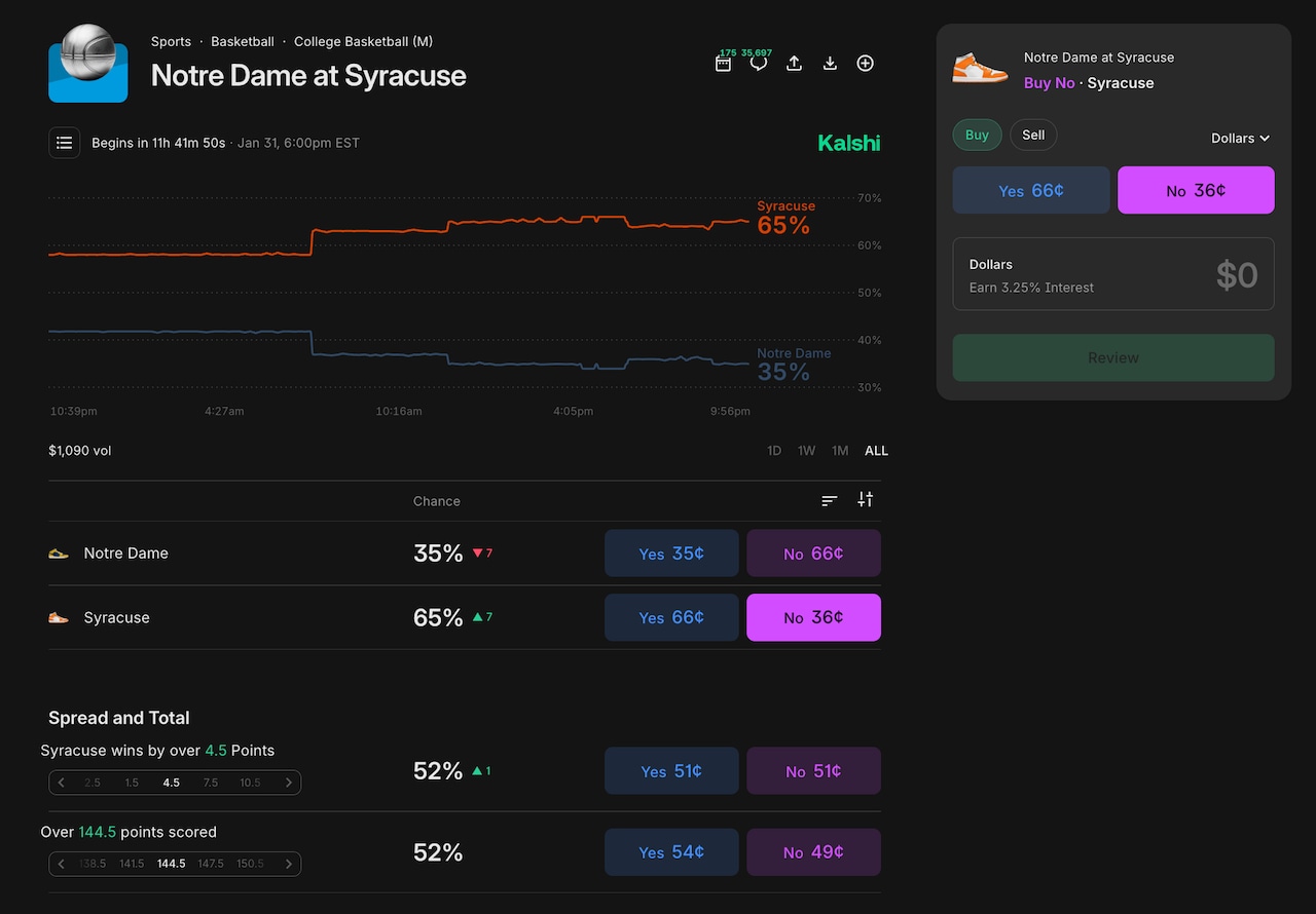 Below we break down how Kalshi works, why it’s legal, and how to trade Syracuse vs. Notre contracts before 6:00pm tip-off tonight.
