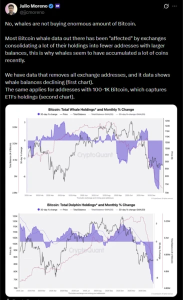 The popular narrative that large holders are aggressively buying Bitcoin (BTC) is misleading, said Julio Moreno, head of research at CryptoQuant. Much of the publicly shared “whale accumulation” data is distorted by exchange-related activity rather than genuine investor behavior.