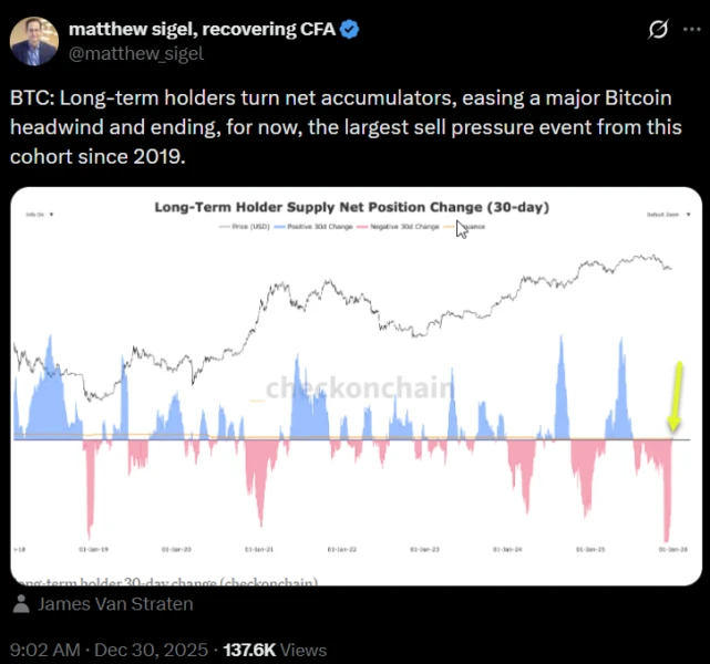 Matthew Sigel, head of digital assets research at VanEck, said Bitcoin’s long-term holders have become net accumulators over the past 30 days, following what he described as the cohort’s largest selling event since 2019.