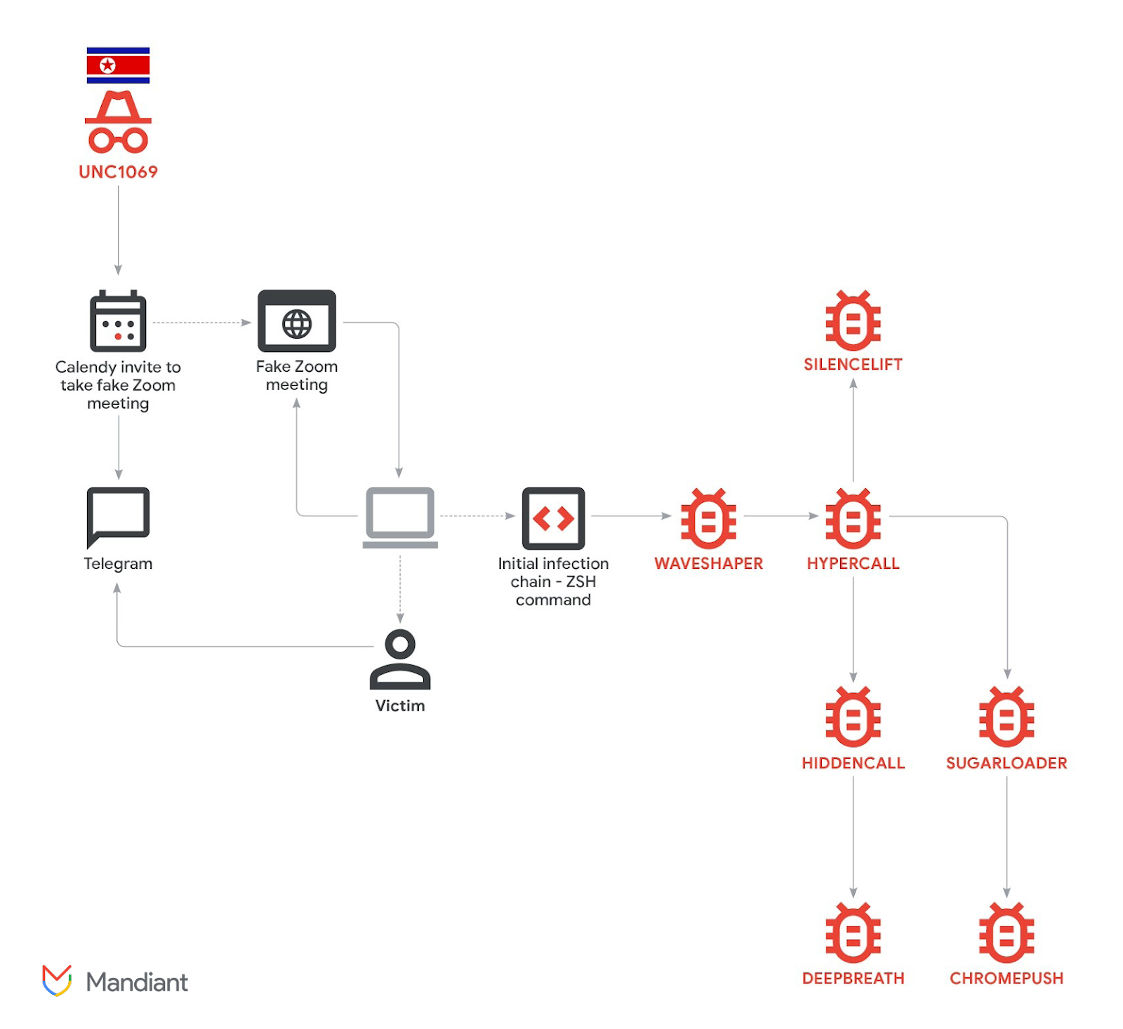UNC1069, assessed to be active since at least April 2018, has a history of conducting social engineering campaigns for financial gain using fake meeting invites and posing as investors from reputable companies on Telegram. It’s also tracked by the broader cybersecurity community under the monikers CryptoCore and MASAN.