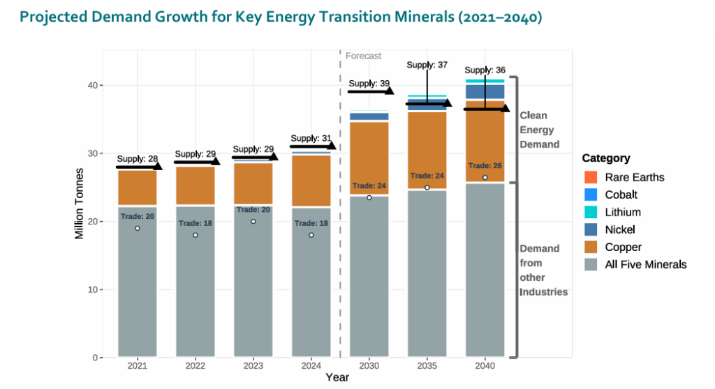 The IEF report shows global demand for the five key minerals (copper, nickel, cobalt, lithium and rare earth elements) rising from 28 million tonnes in 2021 to nearly 41 million by 2040, highlighting the growing dependence of clean energy technologies on mineral-intensive supply chains.