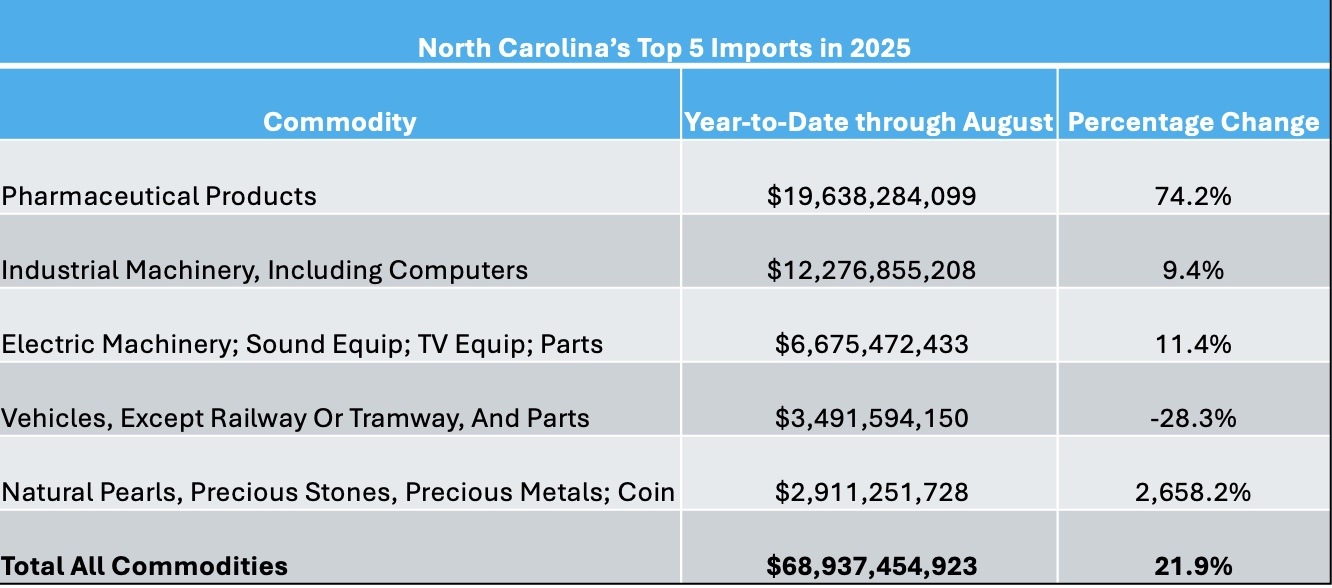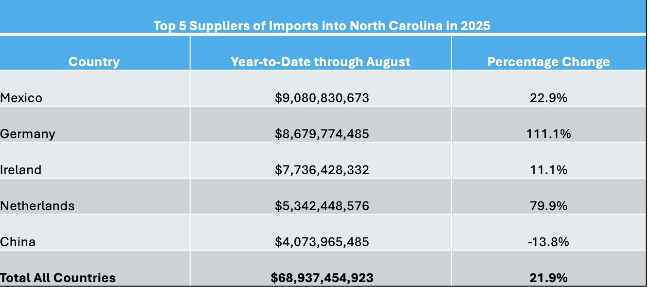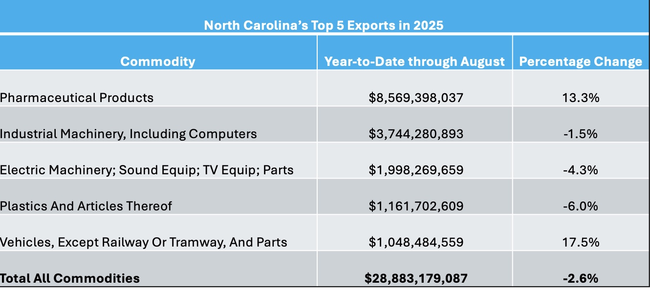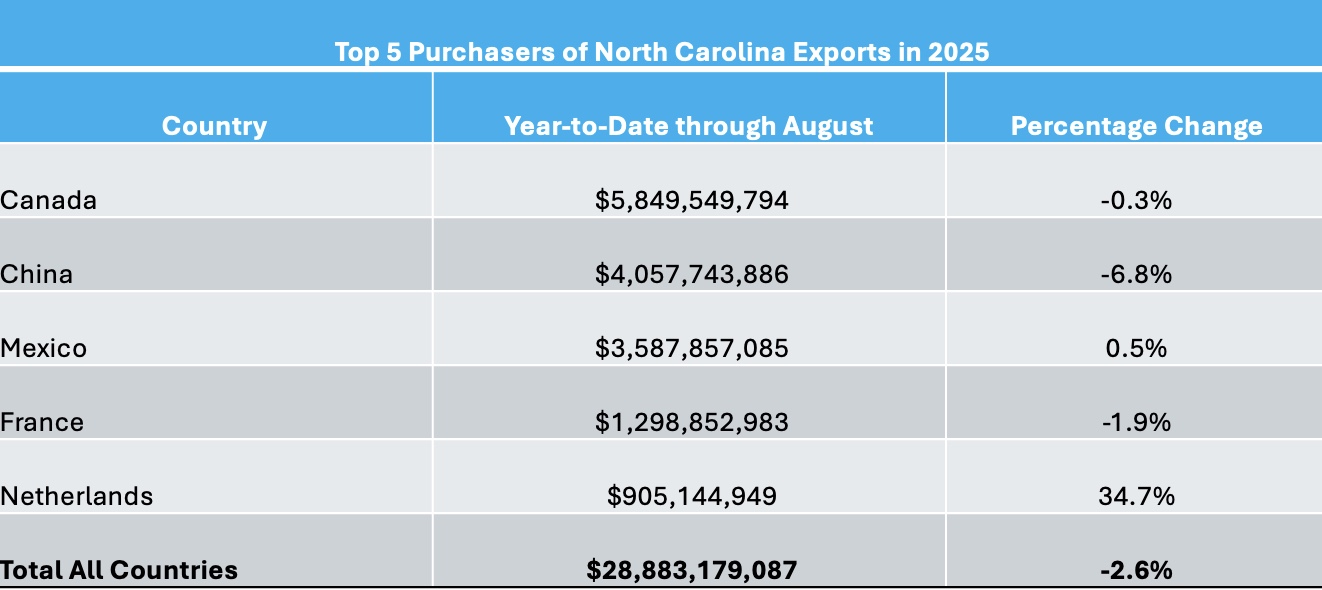 “Both of North Carolina’s top trading partners are in North America. Mexico is the state’s largest source of imports, sending approximately $9.1 billion in goods through August — an increase of 22.9% from last year,” continued Harris. “Canada has long been the largest purchaser of North Carolina exports, and despite global trade tensions, that trend has continued. North Carolina producers have shipped $5.8 billion in commodities to Canada this year, a slight dip of just 0.3% compared to last year.”