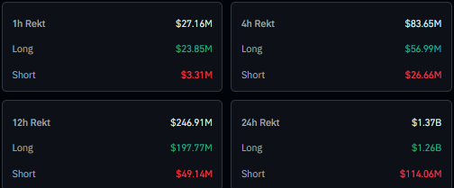 Liquidations exceeded $1 billion over 24 hours, with bitcoin longs accounting for a major share.