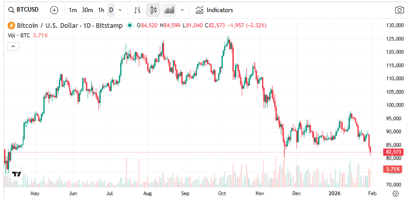 The cryptocurrency now trades over 34% below its record in October of over $126,000, which happened amid an institutionally fueled run-up related to inflows of spot ETFs.
