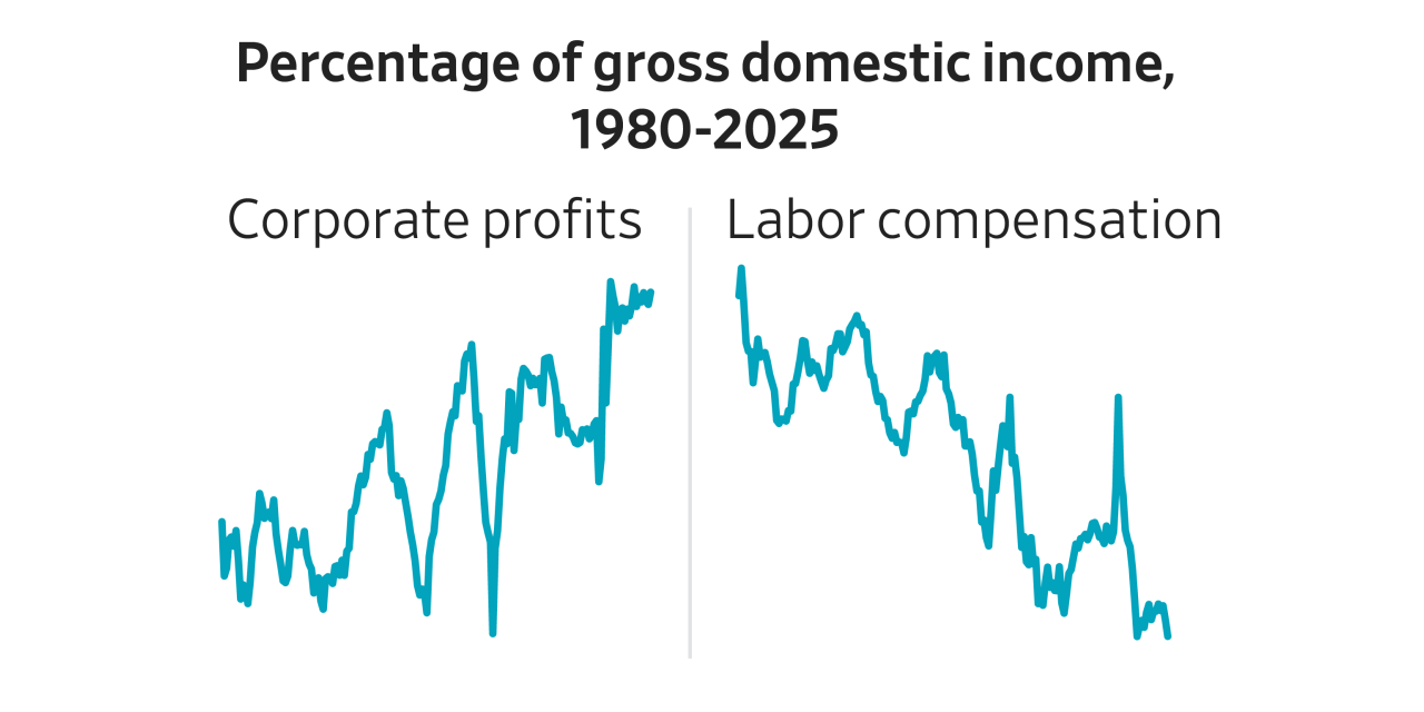 Wall Street Journal The Big Money in Today’s Economy Is Going to Capital, Not Labor This post was originally published on this site. Soaring profits and stocks funnel more of GDP toward companies, their top employees and shareholders. AI will intensify this trend. By Greg IpFebruary 10, 2026February 10, 2026No comment