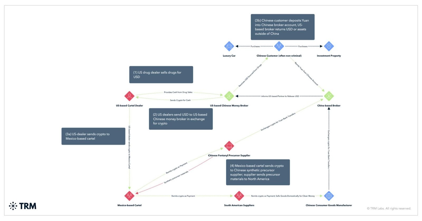 TRM graph with explanations, showing how the cartels and Chinese brokers use cryptocurrencies to launder drug money