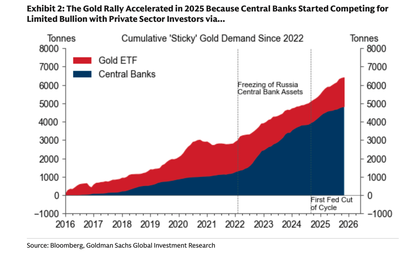 Central banks bought a monthly average of 17 tonnes of gold per month, pre-2022. Today, the Goldman analysts say the 12-month average is 60 tonnes per month.