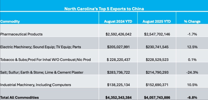 Pharmaceutical products are North Carolina’s top export to China, but they decreased from $2.6 billion to $2.5 billion, a 1.7% drop from the previous year. Electrical machinery and electronics, the state’s No. 2 export, increased from $205 million to $230.7 million, representing a 12.5% increase from the previous year. Tobacco and nicotine-related products (No. 3) increased slightly from $228.2 million to $228.5 million, a 0.1% increase from the prior year. Stone, lime, and cement products (No. 4) decreased from $283.7 million to $214.8 million, a 24.3% decrease from the previous year. Finally, industrial machinery, including computers (No. 5), increased from $138.2 million to $152.7 million, representing a 10.5% increase from the previous year.